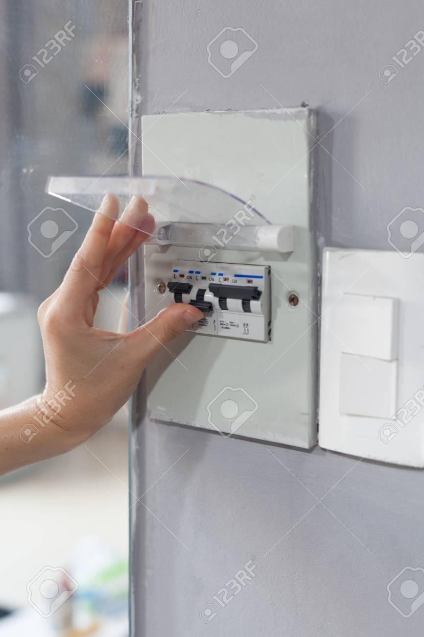 Woman Hand Turning Off Fuse Box In The House Stock Photo Picture